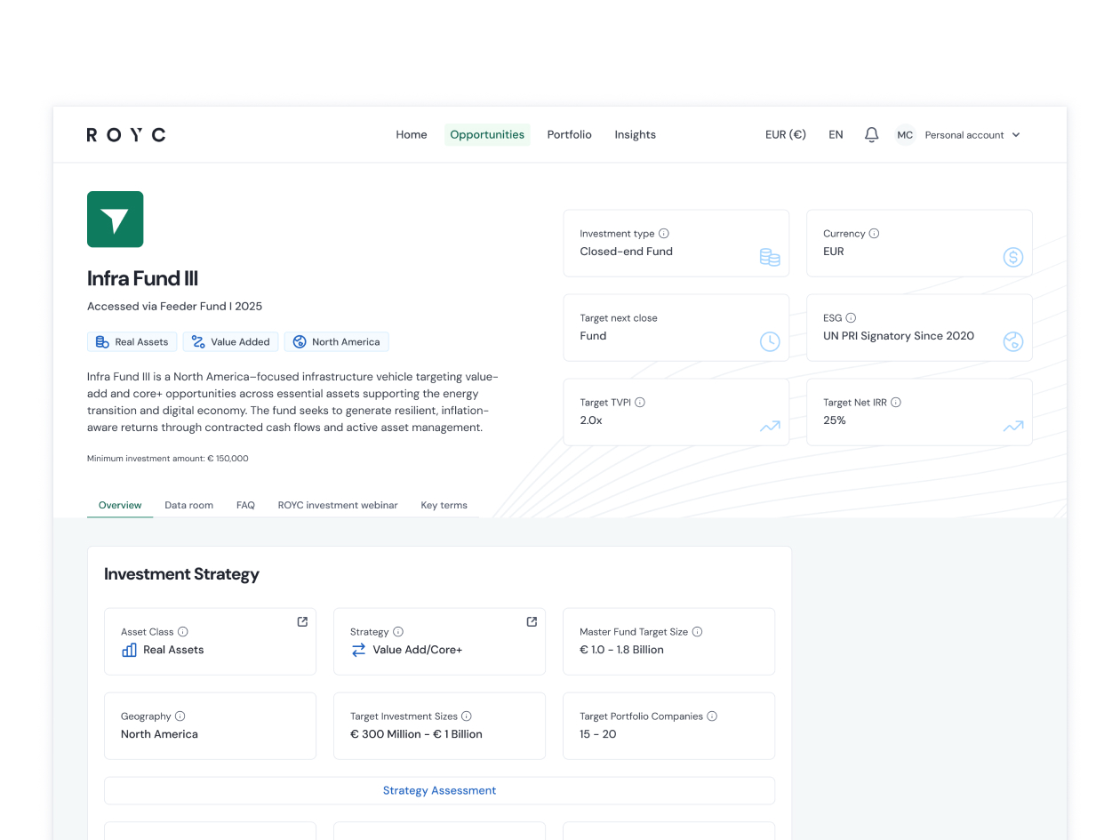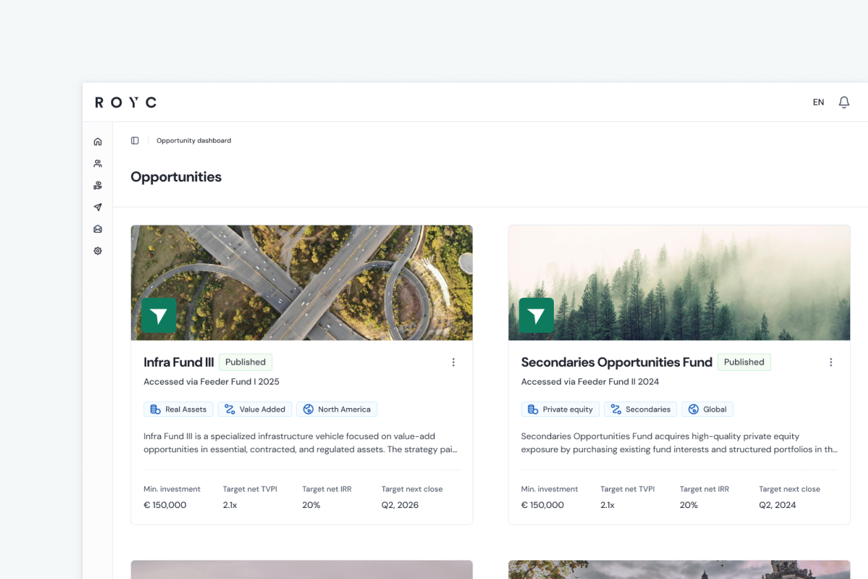 ROYC provides role-specific portals for investors, front office teams, and operations, all working on the same data model, across the full private markets lifecycle.